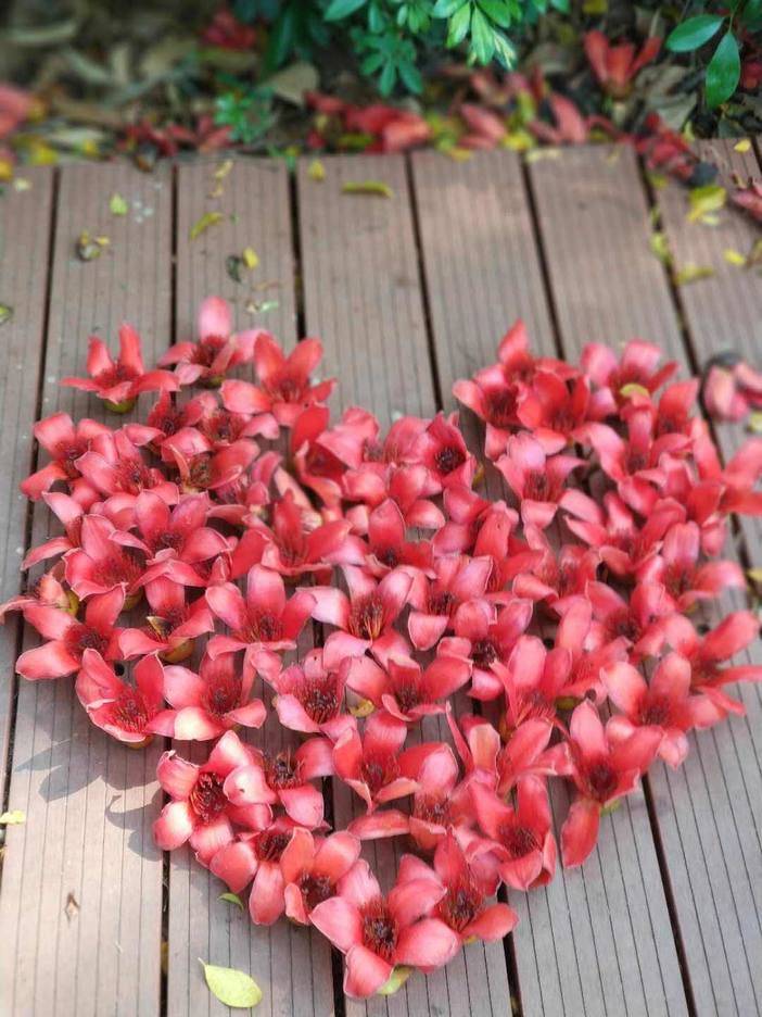 孩子们似乎都走累了,所以我们就短暂的休息下,然而这位小女孩超有爱心的,用掉落的花正在摆一个心形。
