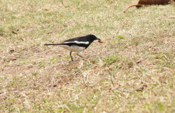 哈,看我们发现了什么——正在进食的鹊鸲,正一步一步的走着,丝毫没有察觉到我们。鹊鸲的两性羽色相异,雄鸟上体大都黑色;翅具白斑;下体前黑后白。但雌鸟则以灰色或褐色替代雄鸟的黑色部分