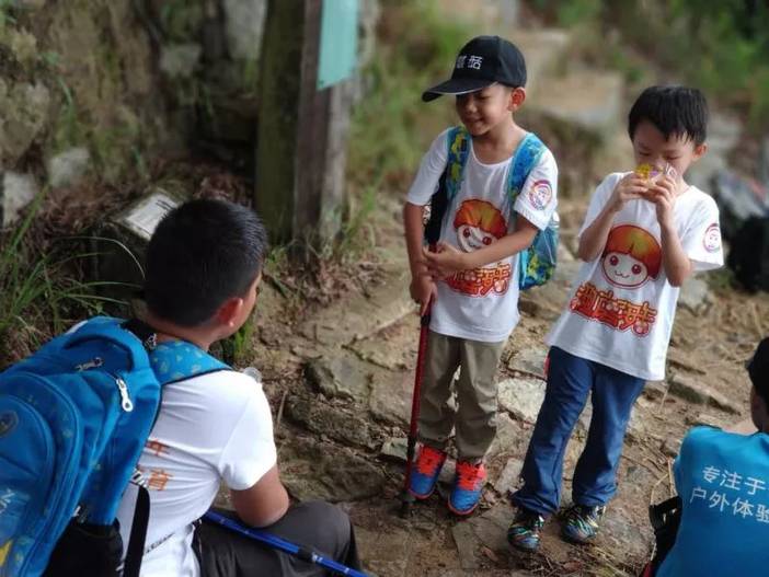 走到海拔300米的时候,这时候该让孩子们摄取一些食物和水分了。