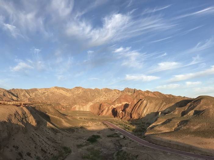 层理交错、岩壁陡峭、气势磅礴、造型奇特、色彩斑斓,在阳光的照射下,像披上了一层红色的轻纱,熠熠泛光,色彩异常艳丽,让人惊叹不已。