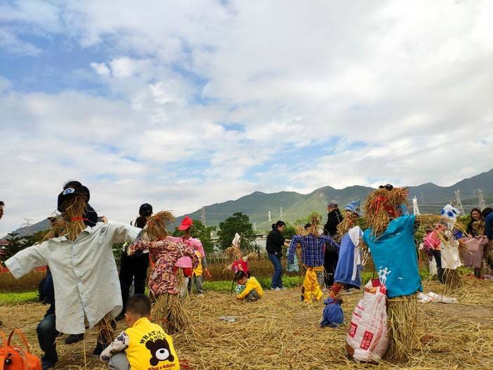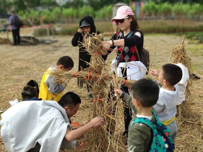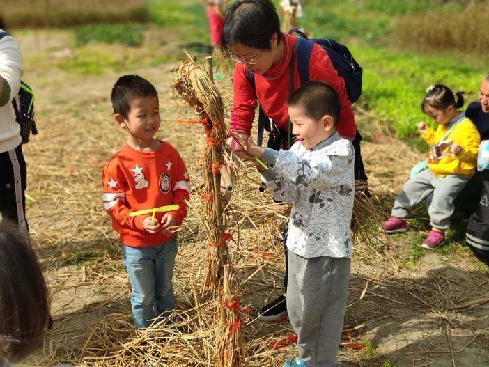 在导师的指导下,孩子们分小组进行扎稻草人任务。在爸爸妈妈的帮助和同学们的相互配合努力下,很快一个个有模有样的稻草人竖立在田野中。
