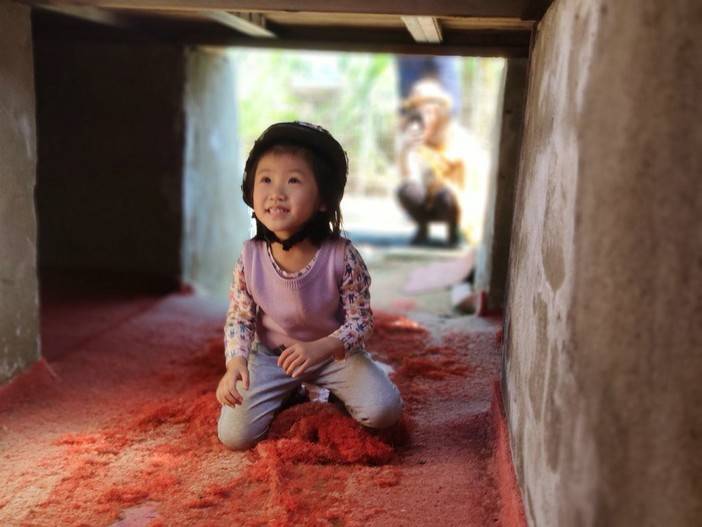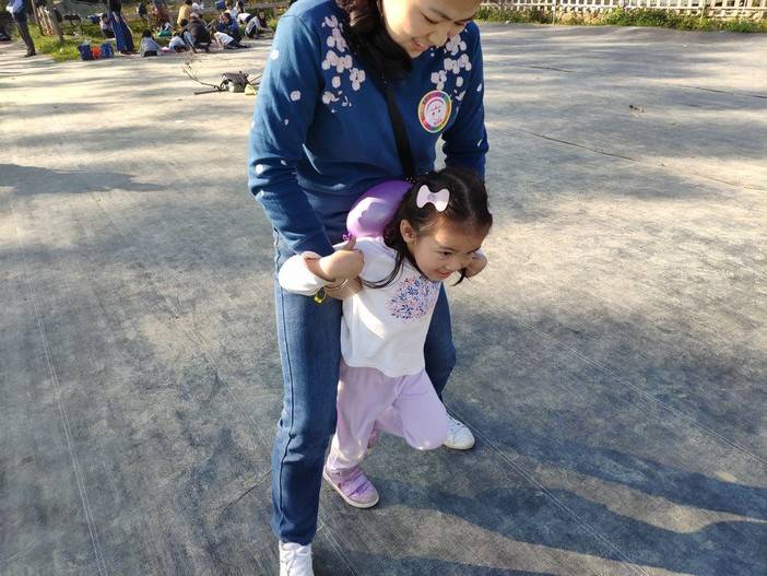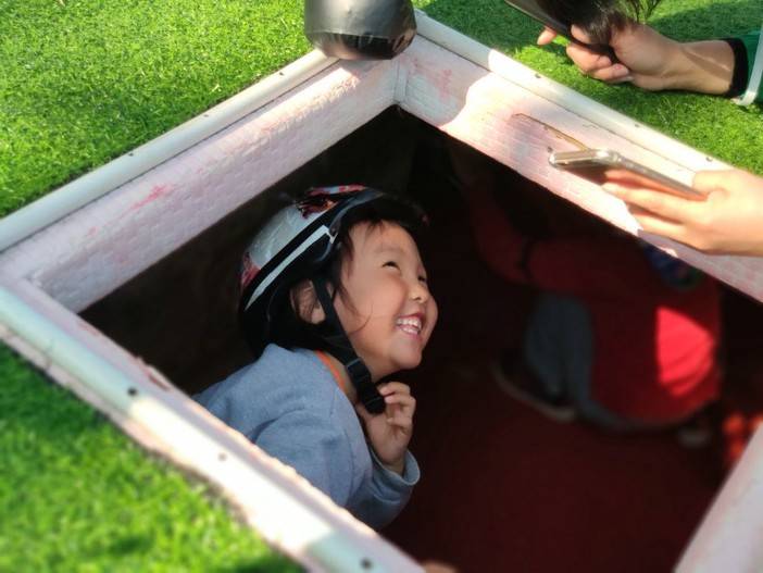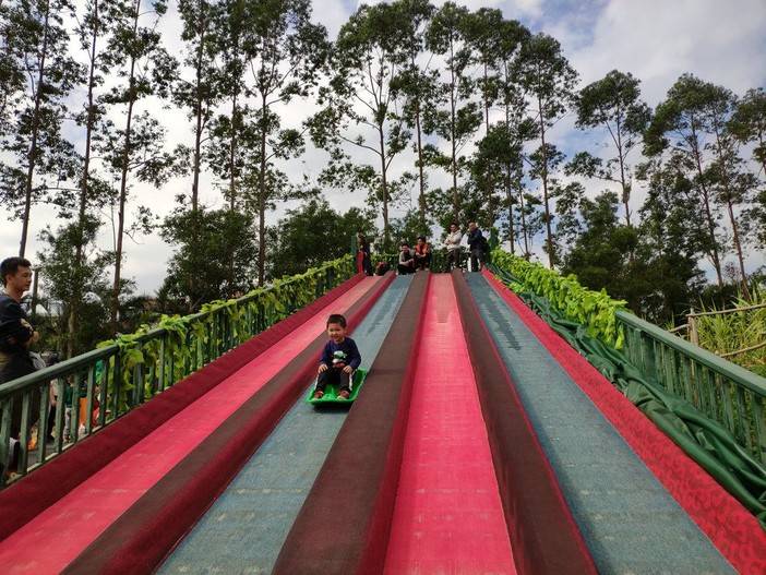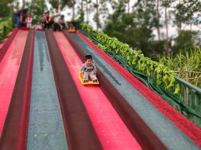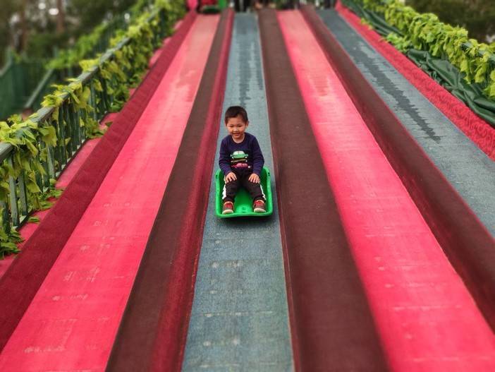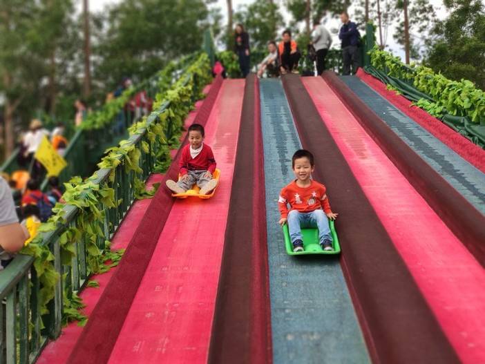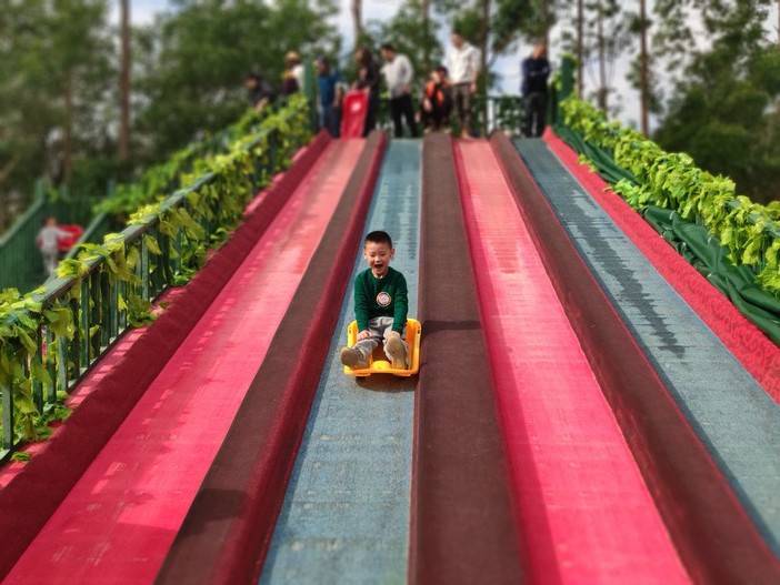 小孩子对滑梯毫无抵抗力,看到这么漂亮的滑梯更是想玩,从上面滑向低处父母的怀里,很是开心。