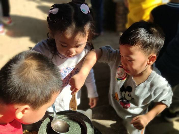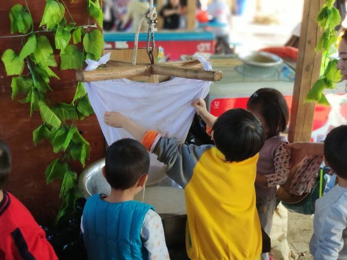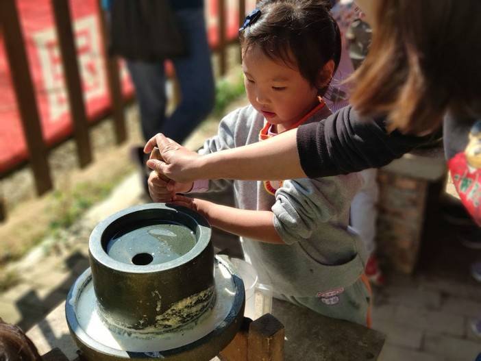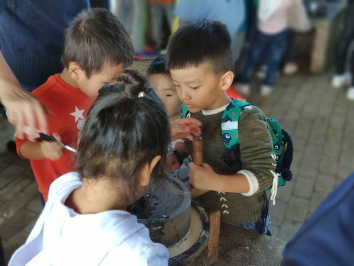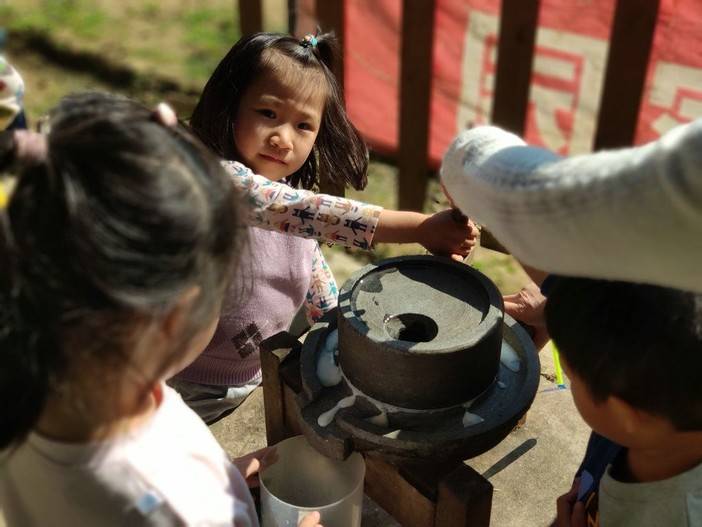 导师教孩子们用石磨磨豆浆,这是需要团队协作的活动,孩子分组一起动手把一颗颗的黄豆,磨成豆浆,然后煮熟,变成大家的饮品。