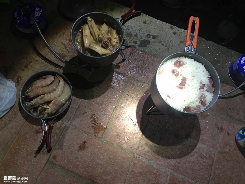 晚上营地做晚餐,香肠米饭、可乐鸡翅、油焖大虾,非常的丰盛哦。这顿露营大餐,孩子大呼过瘾呀