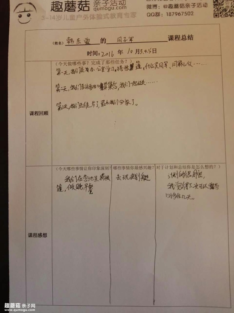 趣蘑菇2016国庆3天童军中级课程回顾和图片分享趣蘑菇国庆3天童军中级课程,第一天深圳室内客,孩子离开父母,与陌生的朋友相互认识了解,组成小队,通过游戏锻炼孩子们相互合作的能力,学习了解什么是童军,练习自己做午餐,搭帐篷,做食品计划,学习如何装包和背包,为接下来独立完成2天的香港露营做好准备。2017元旦继续组织,3天童军中级课程,欢迎预约报名。【活动报名】2017元旦趣蘑菇3天童军中级户外课程之香港露营+麦理浩径二段徒步(单孩子)网址:http://www.qumogu.com/thread-718-1-1.html【活动回顾】活动第一天:深圳,童军介绍和团队建立、做物资和食品计划与准备。 第一游戏,自我介绍,过关简短的自我介绍,让别人快速记住你,也是一种能力 第二个游戏,破冰游戏,让孩子们由认识逐步走向熟悉 对于这个课程,我们都有什么期待呢,选择一张卡片,来代表自己。 第三个扑克牌游戏,让孩子明白,合作不只是几个人走到一起,人的才能是各不相同的,是需要大家不同分工,共同合作的 学习什么是童军,一个人,一本书,一次活动,了解童军的精神 尝试自己做午餐,从来没有下过厨也没关系,煎个鸡蛋,其实很简单。 学习如何搭帐篷,自己把帐篷搭建好 为接下来的2天做食品计划,食物不够,就可能饿肚子哦。快乐的第一天,学习就在游戏中结束了,在最后做课程回顾时,大家都不约而同说了,做事情,需要大家一起合作。第一天,团队融合训练,为接来2天孩子们相处,减少了很多矛盾,帐篷也知道4个人合作一起搭,比2个人更快,更省力。