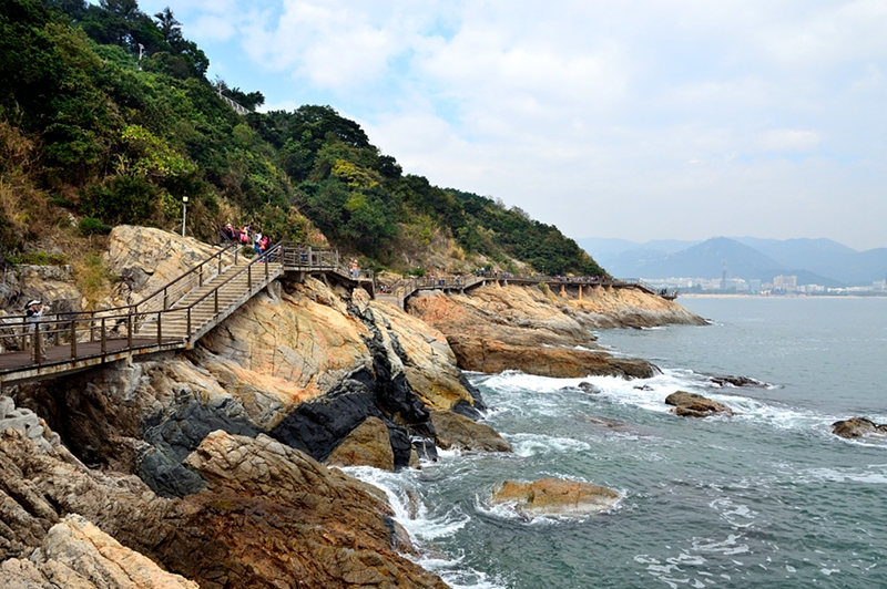 深圳盐田海滨栈道西起中英街,东至背仔角,自西向东由中英街段、沙头角段、港区段、渔港段、大梅沙段及小梅沙段组成。沿途设有登山道、步道、景观平台、大栈桥、石拱桥。一头连接着大梅沙的蓝天碧海自然风光,一头牵着中英街的“一街两制”百年人文,盐田滨海栈道与蛇口至红树林的深圳湾海滨栈道成呼应之势。