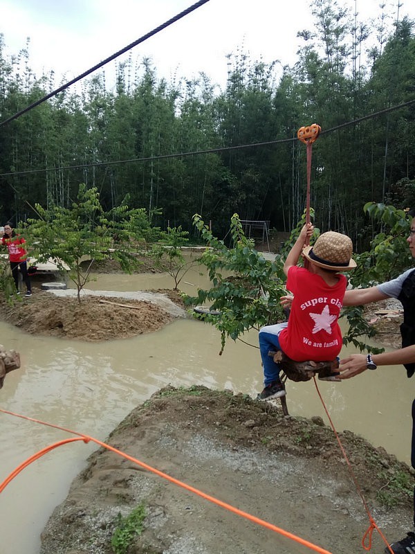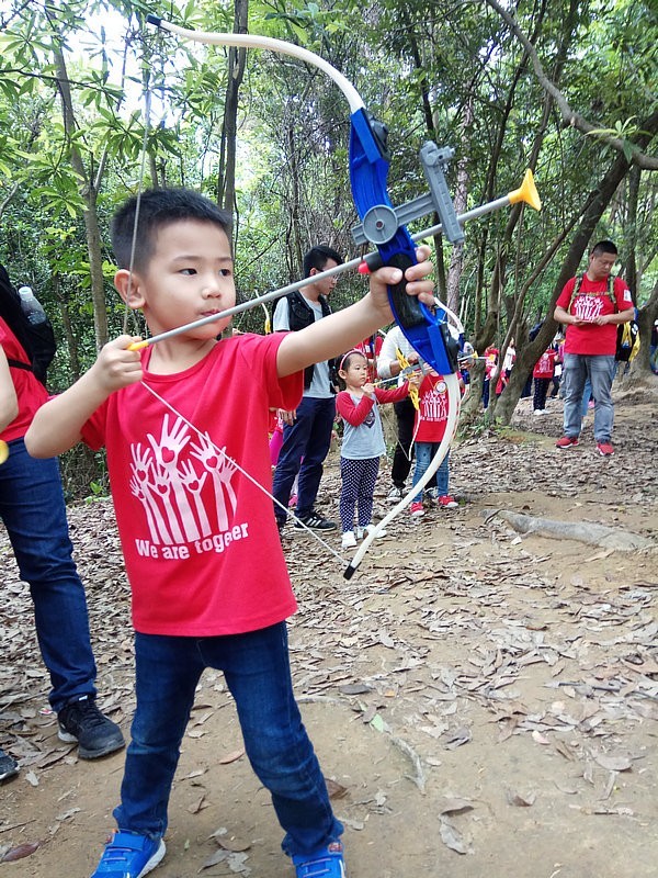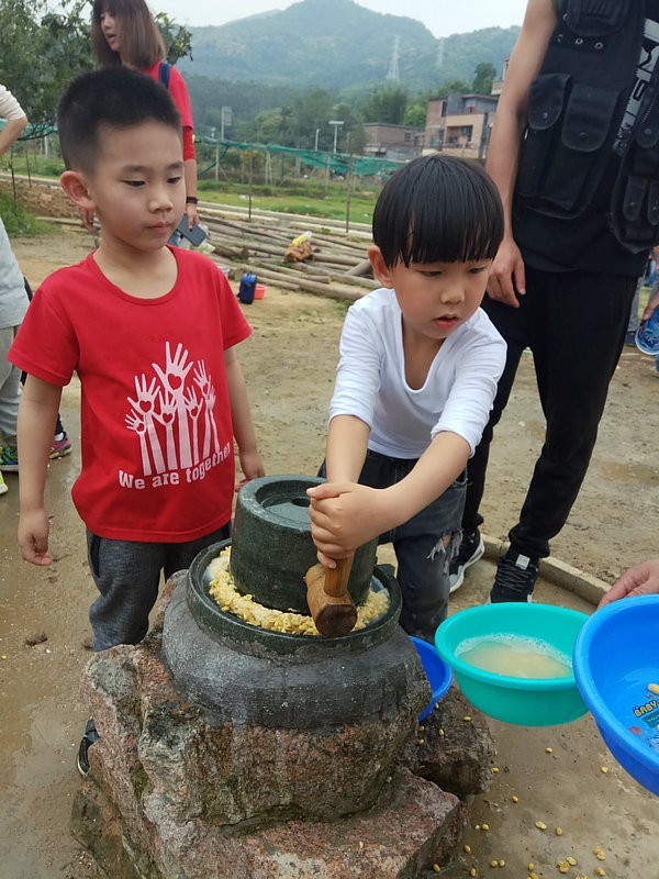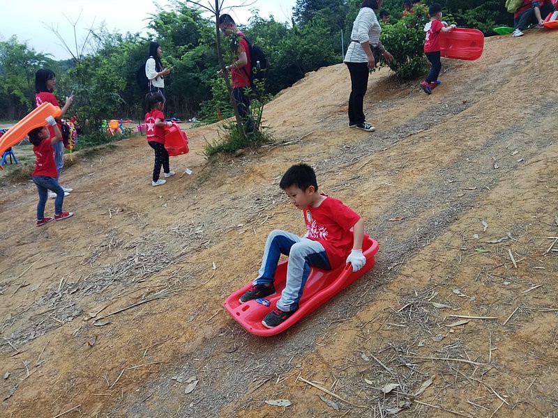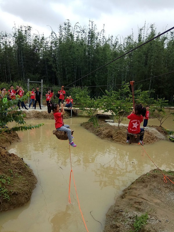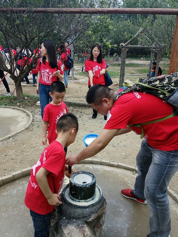 2017年4月15日趣蘑菇亲子组织俊峰丽舍幼儿园某班到广州自然学校玩土坡滑草、丛林射箭、云梯速降、喂小鸡、捡鸡蛋、水上溜索、真人打地鼠、石磨豆浆、亲子拔河等项目