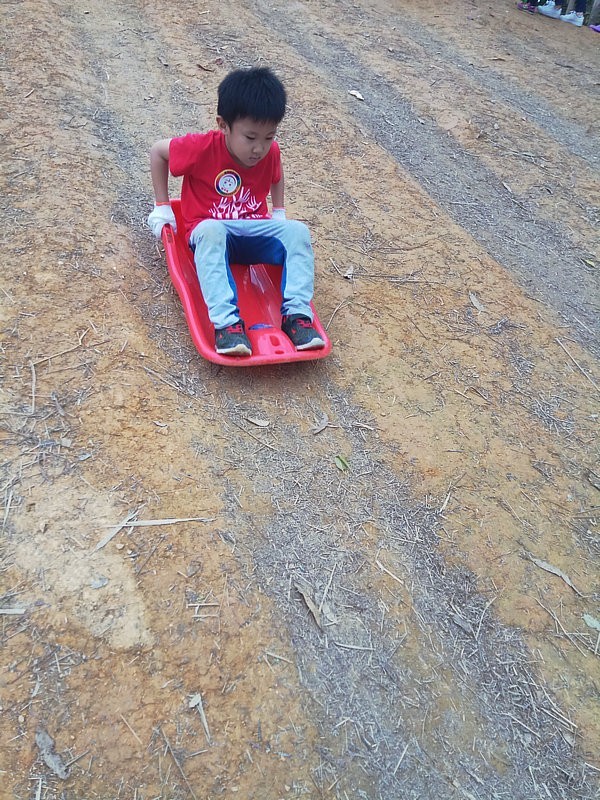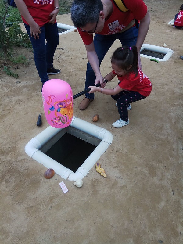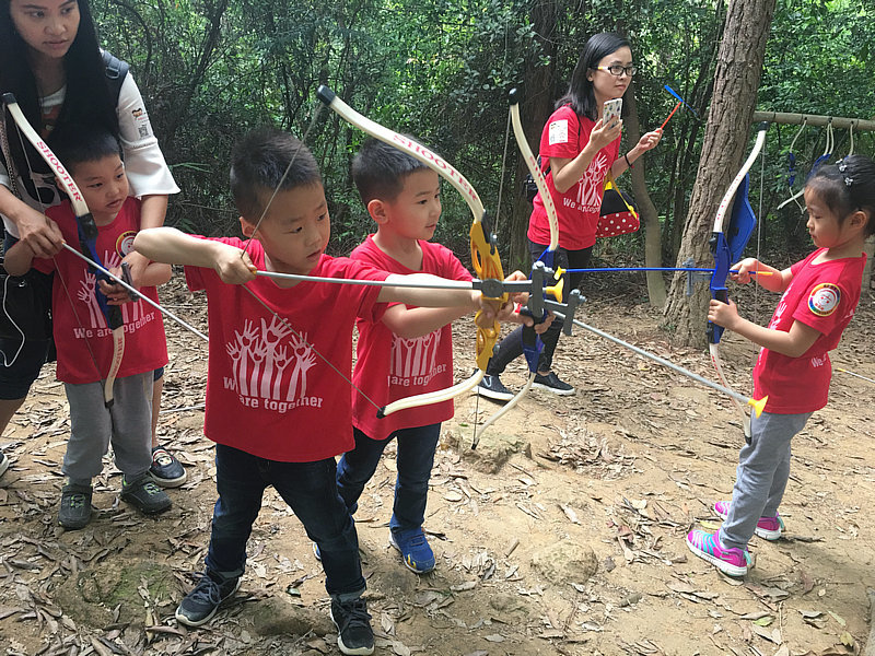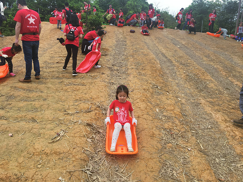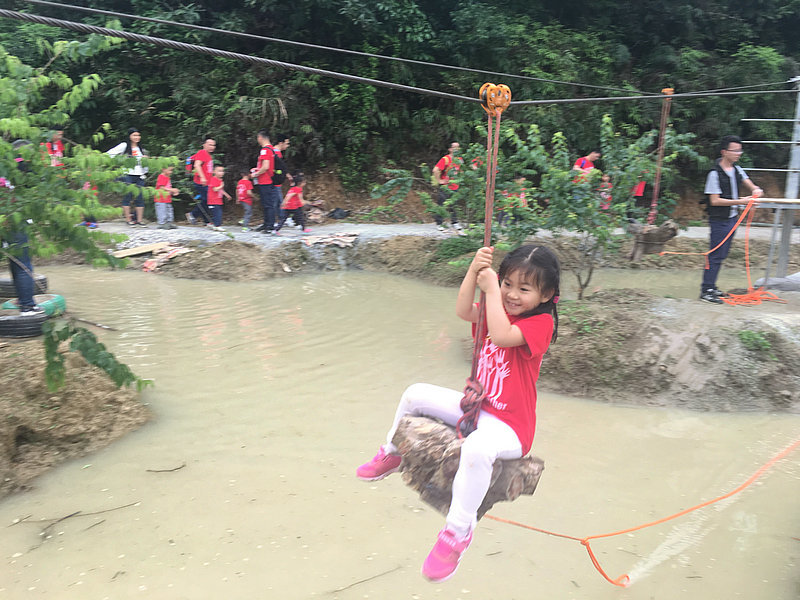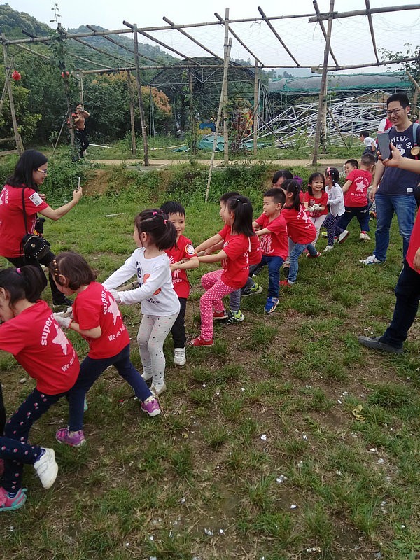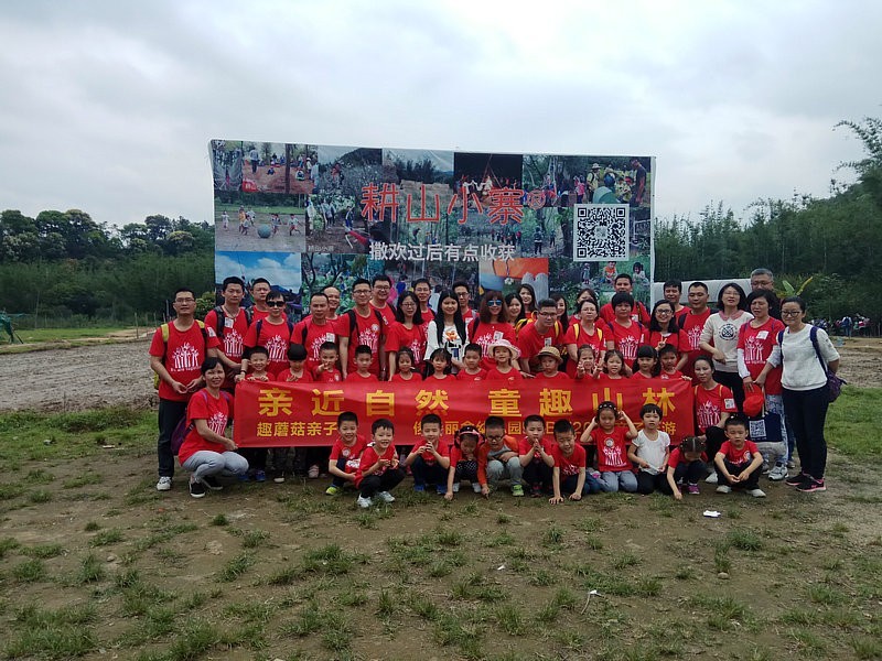 2017年4月15日趣蘑菇亲子组织俊峰丽舍幼儿园某班到广州自然学校玩土坡滑草、丛林射箭、云梯速降、喂小鸡、捡鸡蛋、水上溜索、真人打地鼠、石磨豆浆、亲子拔河等项目