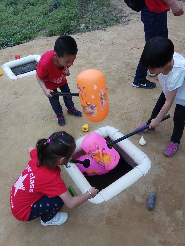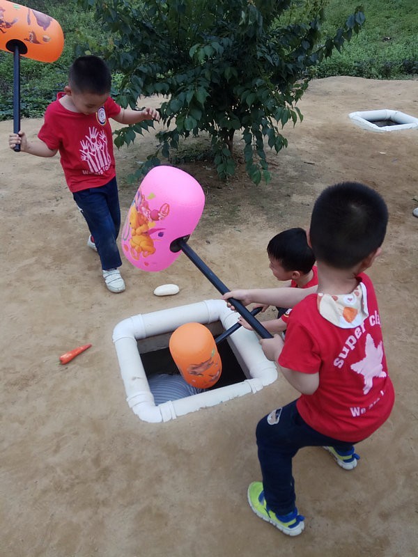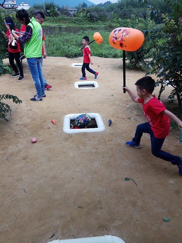 兵分两队,一队扮演老鼠,头戴头盔,进入地道,另一队扮演农民,手持气球棒槌,地道口分布蔬菜。老鼠伸头出来偷菜,农民要保护好蔬菜,将老鼠打入地洞里,孩子都需要合作,计划,才能完成任务。