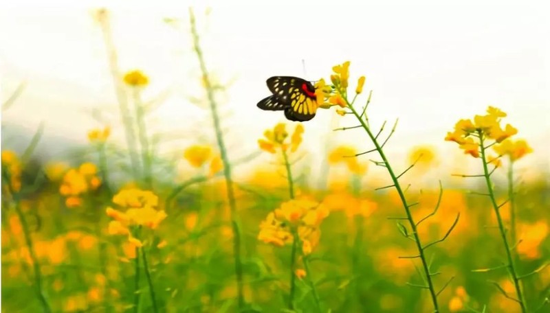 油菜花海里,蜜蜂正在采蜜、蝴蝶正在飞舞,时不时还会有可爱的鸟儿们飞过;惬意十足!