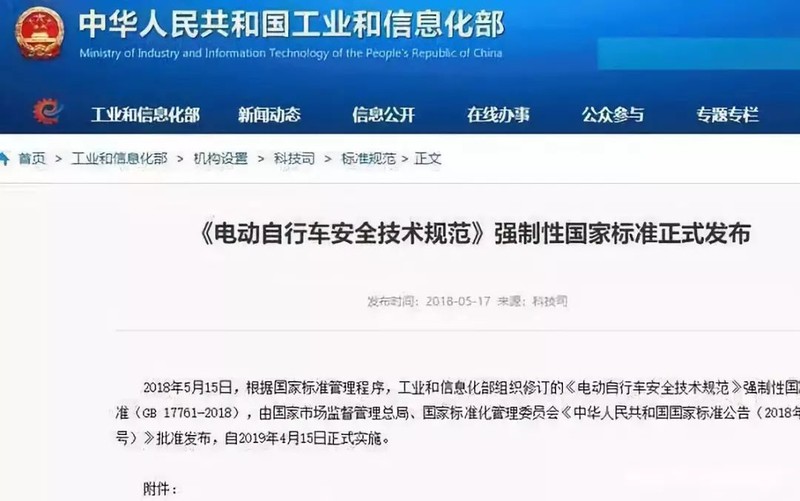 新国标是去年5月份批准发布的《电动自行车安全技术规范》国家标准。新修订的《规范》废除了长达19年的旧规,调整完善了电动自行车最高车速、整车质量、脚踏骑行能力等技术要求,意在保证大众出行安全。