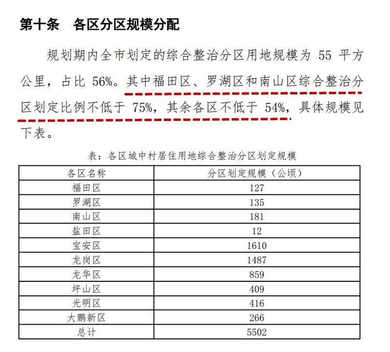 规划里表示:福田、罗湖、南山三个区的综合整治分区划定比例不低于75%,其余各区不低于54%。