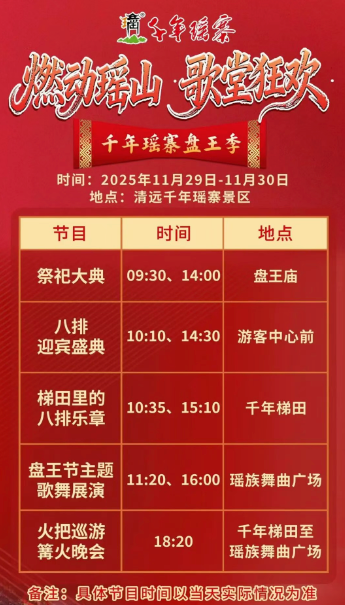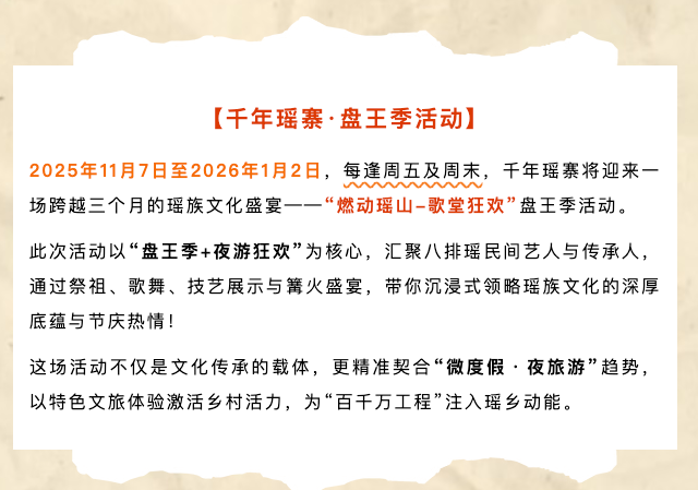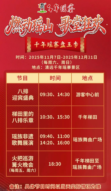 活动期间(2025年11月7日-2026年1月2日)的每个周五、周末及元旦假期,瑶寨都将安排精彩演出。(以景区实际为准)
