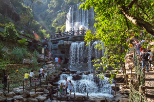 位于瀑布群入口的双龙瀑布,形似两条白龙,一曲一直,一隐一现,犹如双龙迎宾,沿着双龙瀑逆溪而上,林密谷幽,瀑流相伴,自下而上分布着天龙、藏龙、飞龙、见龙、猛龙、跃龙、云龙等九级阶梯瀑布,有的水帘悬挂,有的银珠飞溅,有的飞流直下。“飞流直下三千尺,疑似银河落九天“就是此意境。