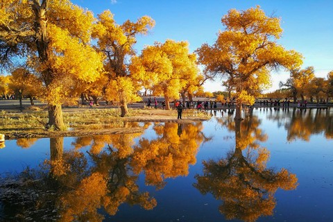 适时离开,前往【金塔胡杨林】,前面已经看了两天的胡杨林,是不是有些视觉疲劳?其实,我们贴心安排这里,是担心气候原因,胡杨的叶子变黄时间无法掌控,多一处胡杨林就多一次机会。再者,金塔胡杨林树龄不长,游人也较少,水中倒影更富情趣,是美美凹造型的好地方。