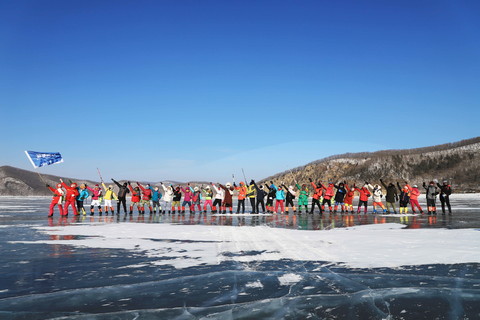 出发前发放巧克力、饼干等食物补给,往【镜泊湖蓝冰徒步10KM】,冰面风大,较为寒冷,今天需要穿的更厚一些 。这里是国内最大的高山熔岩堰塞湖,冬季结冰一米多深,冰面呈蓝色,在蓝天的映衬下,犹如贝加尔湖的蓝冰美丽。