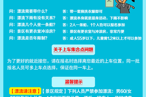 1、在进行漂流、探险活动前请仔细听导游讲解注意事项,在漂流过程中请听从工作人员安排。以防出现意外。