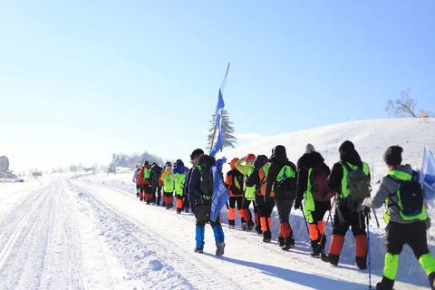 09 : 00开始【徒步梦幻雪山】,全程徒步10KM,我们稍微热身。随后大部队出发;我们走的这条梦幻雪山的徒步路线是我们最先开发的路线,一路上都可以看到给我们加油打气的木牌。我们来的时候雪山早已被皑皑白雪覆盖,一路上深一脚浅一脚的徒步,一不小心就有人被雪埋了半截。偷偷告诉大家千万不(用)要(力)上去给他全埋进雪里哦~
