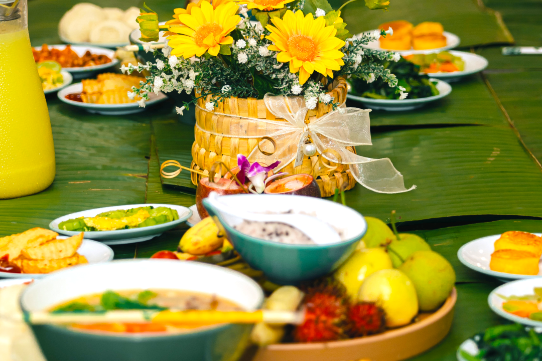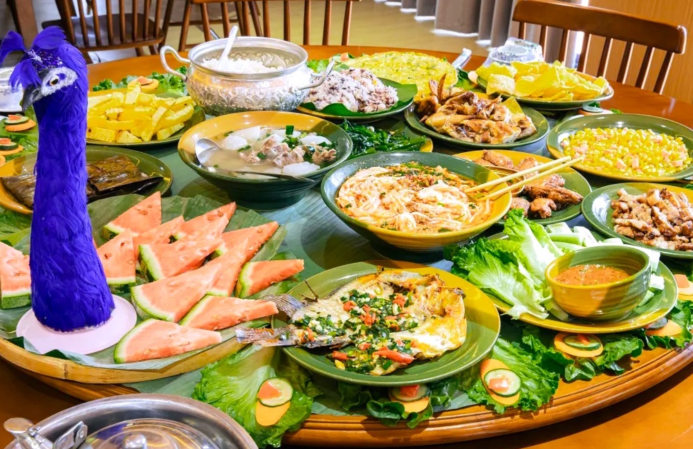 以孔雀开屏为形,汇融香茅烤鱼、泼水粑粑等十余种傣家经典。这是傣族最高待客礼,傣族人把对美的追求,都盛放在了每日的餐桌上
