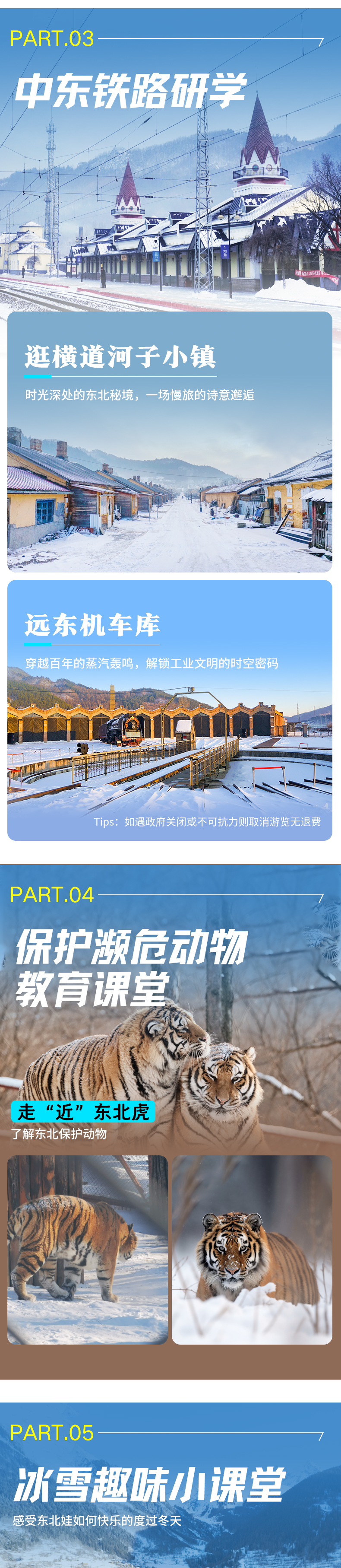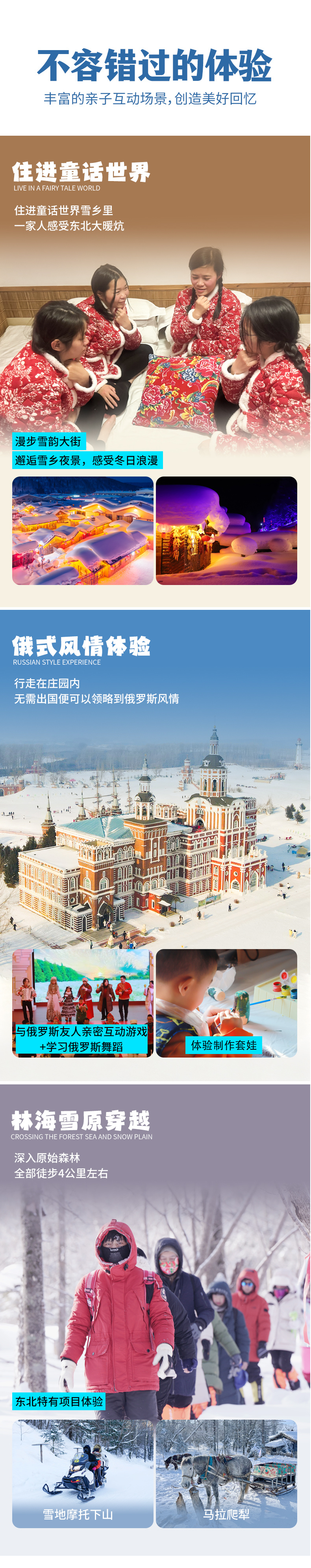 4、门票:雪乡门票+往返环保车、亚布力激情滑雪3小时(包含雪鞋雪板雪杖使用+每个孩子分配1个教练教学1小时)、横道虎林园门票+环保车,伏尔加庄园门票、冰雪画廊轻徒步门票