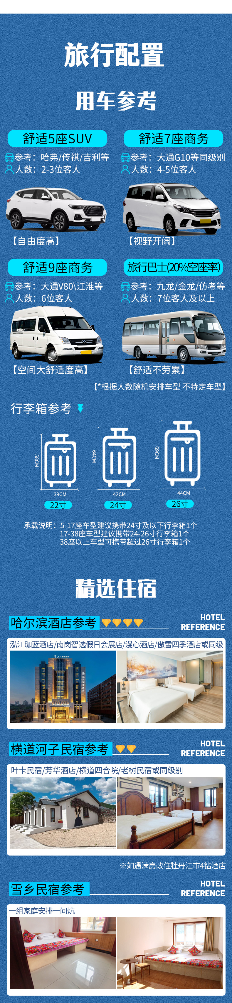 1、住宿:哈尔滨4钻酒店标间3晚(非同一酒店住3晚,D4和D5连住)、雪乡2-4人间独立卫浴农家炕1晚(一组家庭安排一间炕,根据人数安排炕的大小)、横道河子民宿酒店标间1晚(如遇满房改住牡丹江市4钻酒店标间)