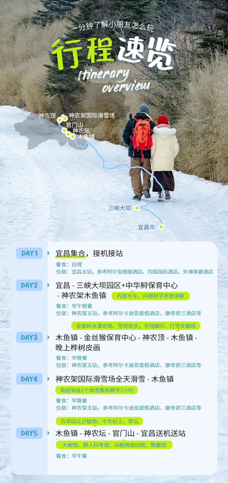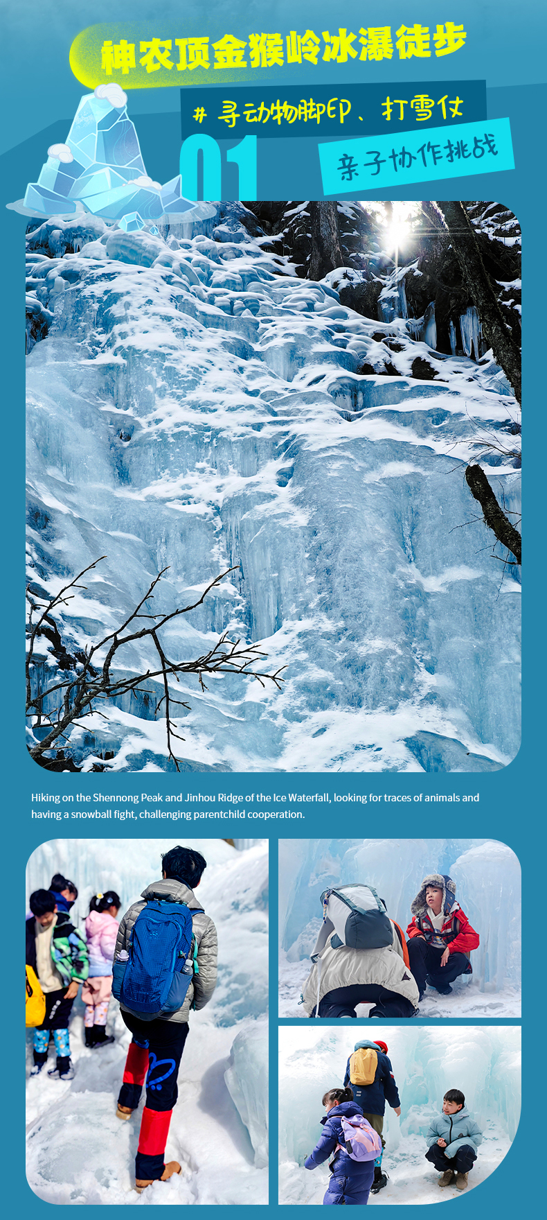 下午:我们将会前往金猴岭,在这里可以看到美丽的蓝冰冰瀑,接下来,我们前往神农顶,在雪地嬉戏,前往丛林,寻找动物脚印;