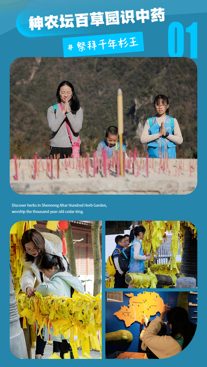 今天我们前往神农坛,在百草园了解神农架中草药种类和特性,瞻仰千年古杉王。在神农祭坛了解神农炎帝“八大功绩”,了解神农祖先的故事;