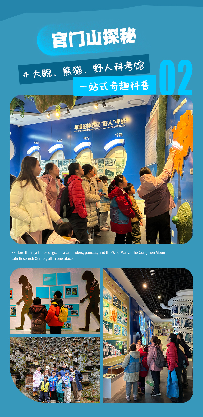 接下来,我们将前往官门山,博览自然博物馆群(地貌厅、地质馆、生物馆、科考馆、民俗馆)、穿行野人洞,了解神农架古地理演进、海陆变迁、生物进化、地理气候、旖旎风光、神农氏传说、珍稀动植物、野人之谜等。前往熊猫馆,近距离观看国宝熊猫,了解官门山大熊猫的由来,运气好的话,还可以看到熊猫耍宝玩雪哦。