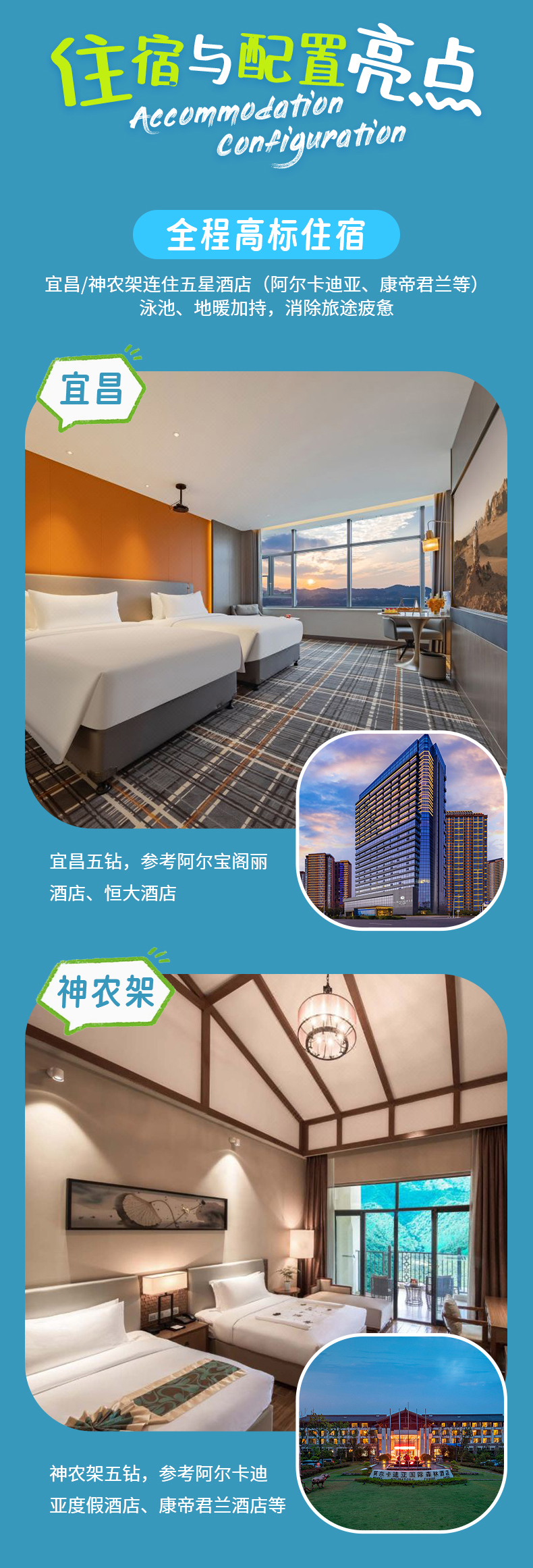 【餐:含早午晚餐; 宿:神农架五钻,参考阿尔卡迪亚酒店、康帝君兰酒店等】