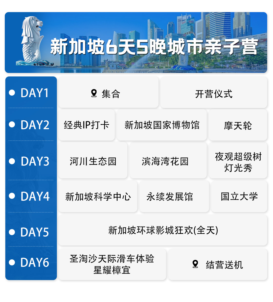 • 根据天气情况及不可抗力,在行程安排上可能会做顺序调整,但不会影响整体行程【如:新加坡国立大学等名校因寒期政策管制导致无法入校,则同级替换其他活动及其他场地,敬请理解】;