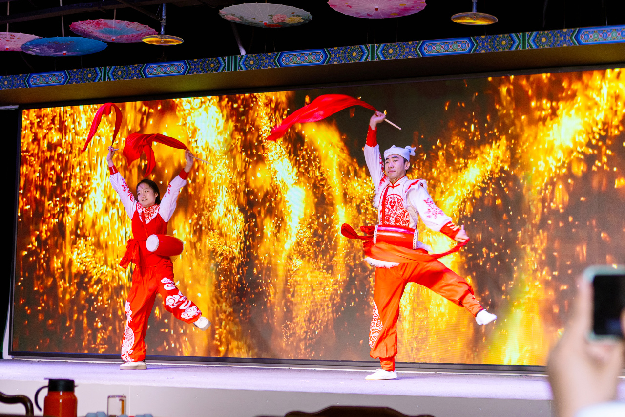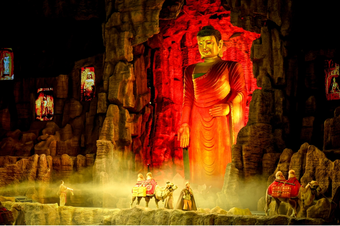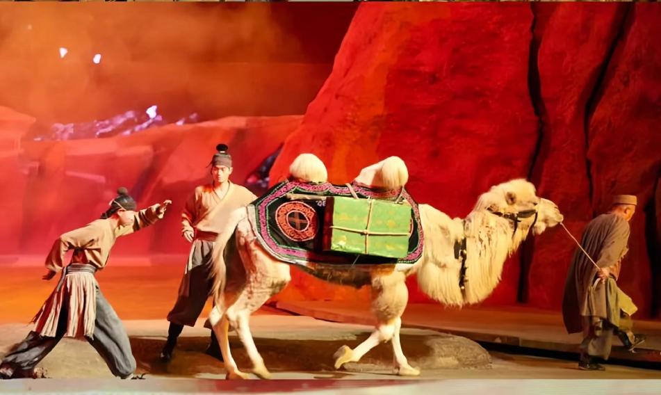 以盛唐丝路文明为魂,汇驼队、狼群、瀑布、佛光等西北元素,突破时空维度,再现千年商队穿越秦岭、横跨大漠的壮阔征程。让观众在苍狼长啸与驼铃声中,重走丝路万里征程。驼铃声响彻耳畔,丝绸之路的千年故事在360度旋转舞台上鲜活重生,东西文明在此完成一场跨越时空的对话