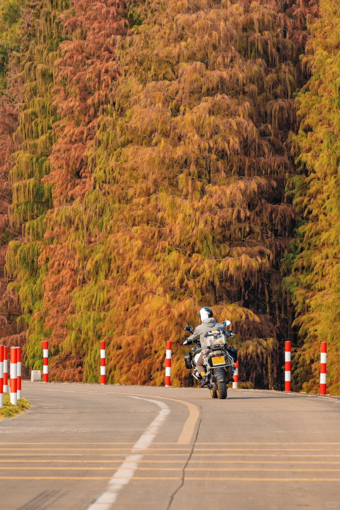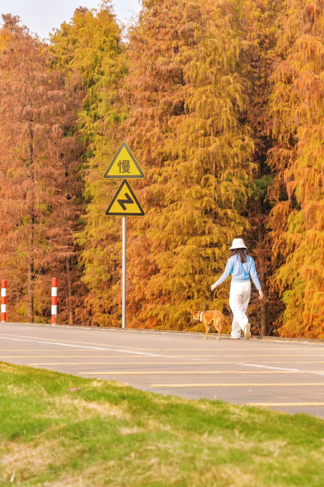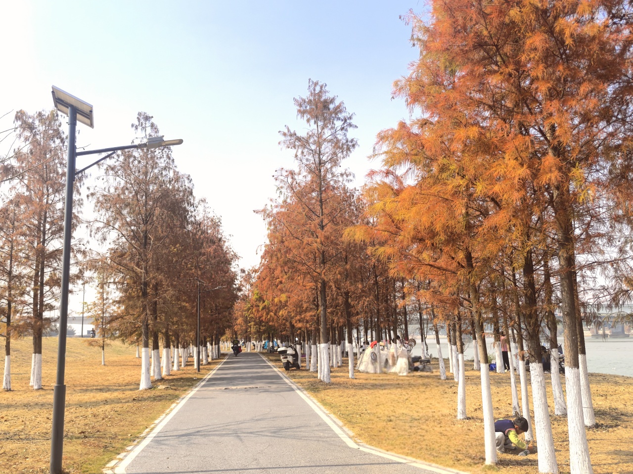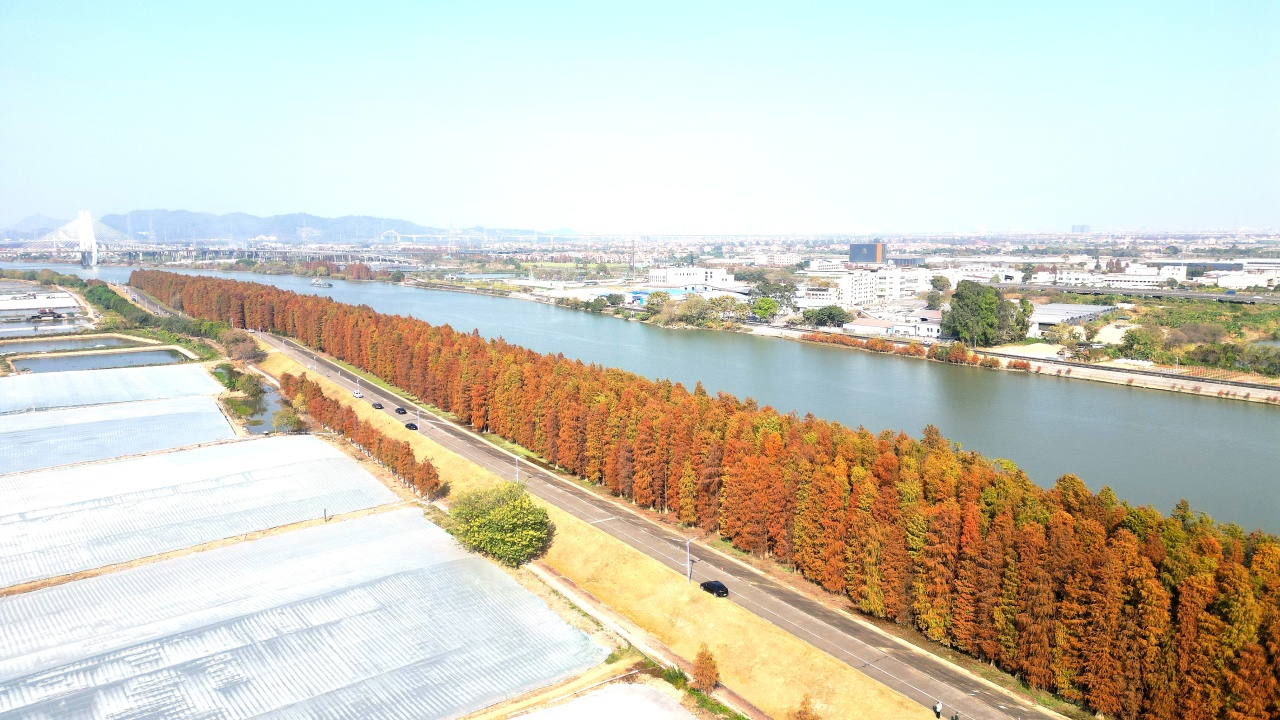 顺德的冬天把浪漫都藏在了乌洲水闸的落羽杉里,几公里的红杉沿江水铺展,焦糖色、橙红色交织,倒映在粼粼波光里,走进去就像闯进莫奈的调色盘。