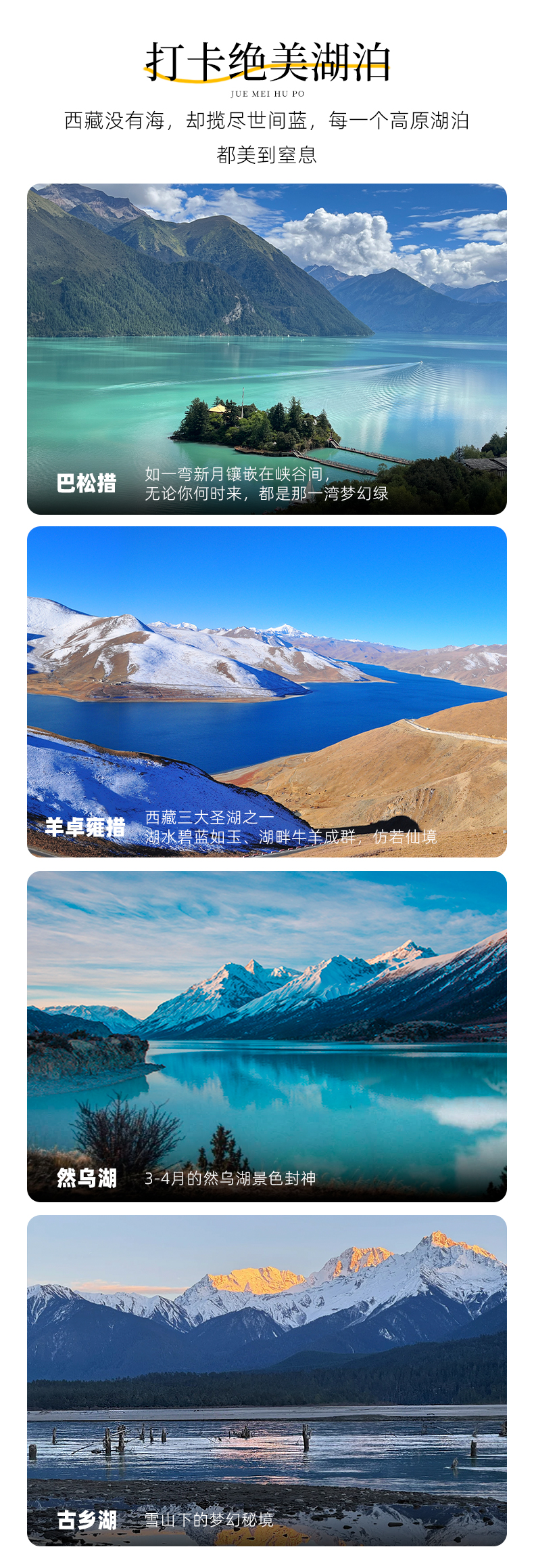 3、门票:巴松措门票、来古冰川门票、嘎拉桃花村门票、雅鲁藏布江大峡谷北岸(索松村)门票、羊湖门票;
