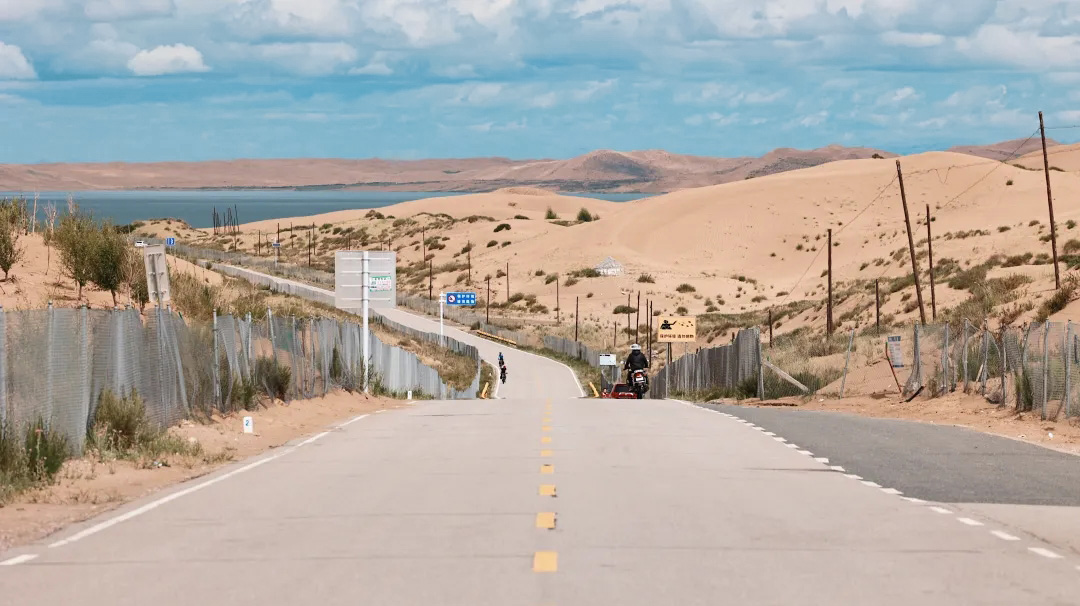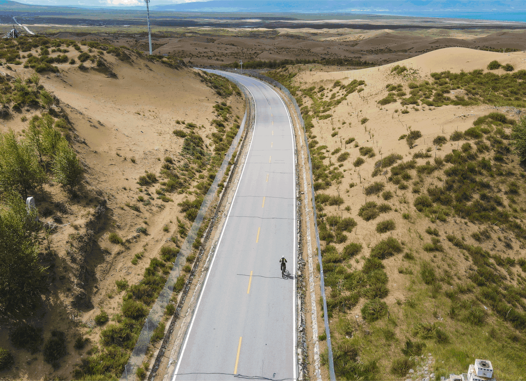 一侧大湖一侧神山的沙漠公路骑行20公里