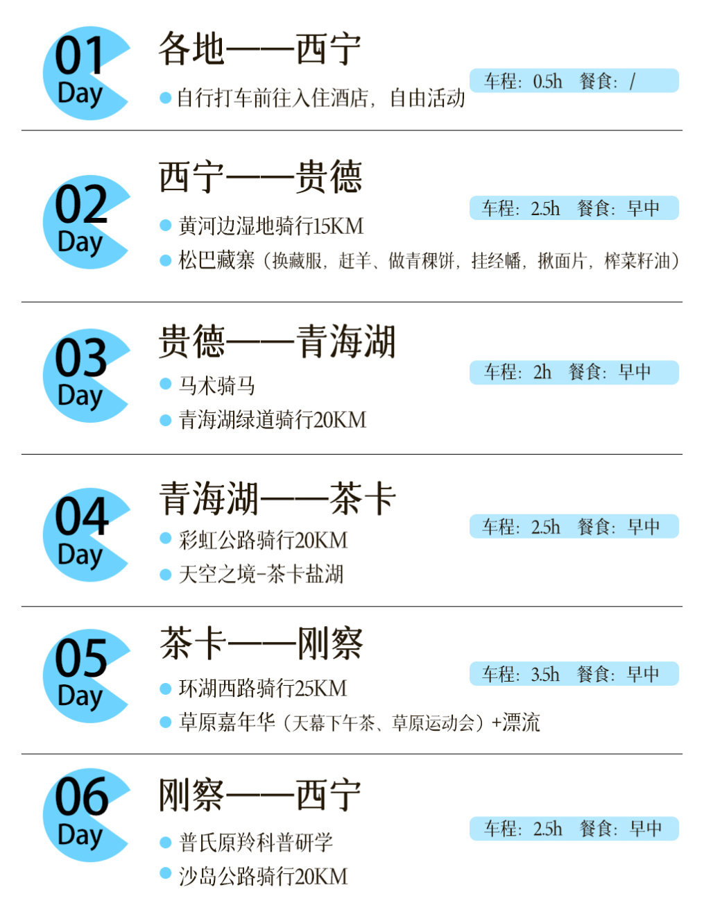 ☑景点及活动:磨青稞粉做青稞饼,换藏服,榨菜籽油,揪面片,马术骑马,天幕下午茶+草原运动会,普氏原羚保护中心研学,草原漂流,茶卡盐湖景区首道门票