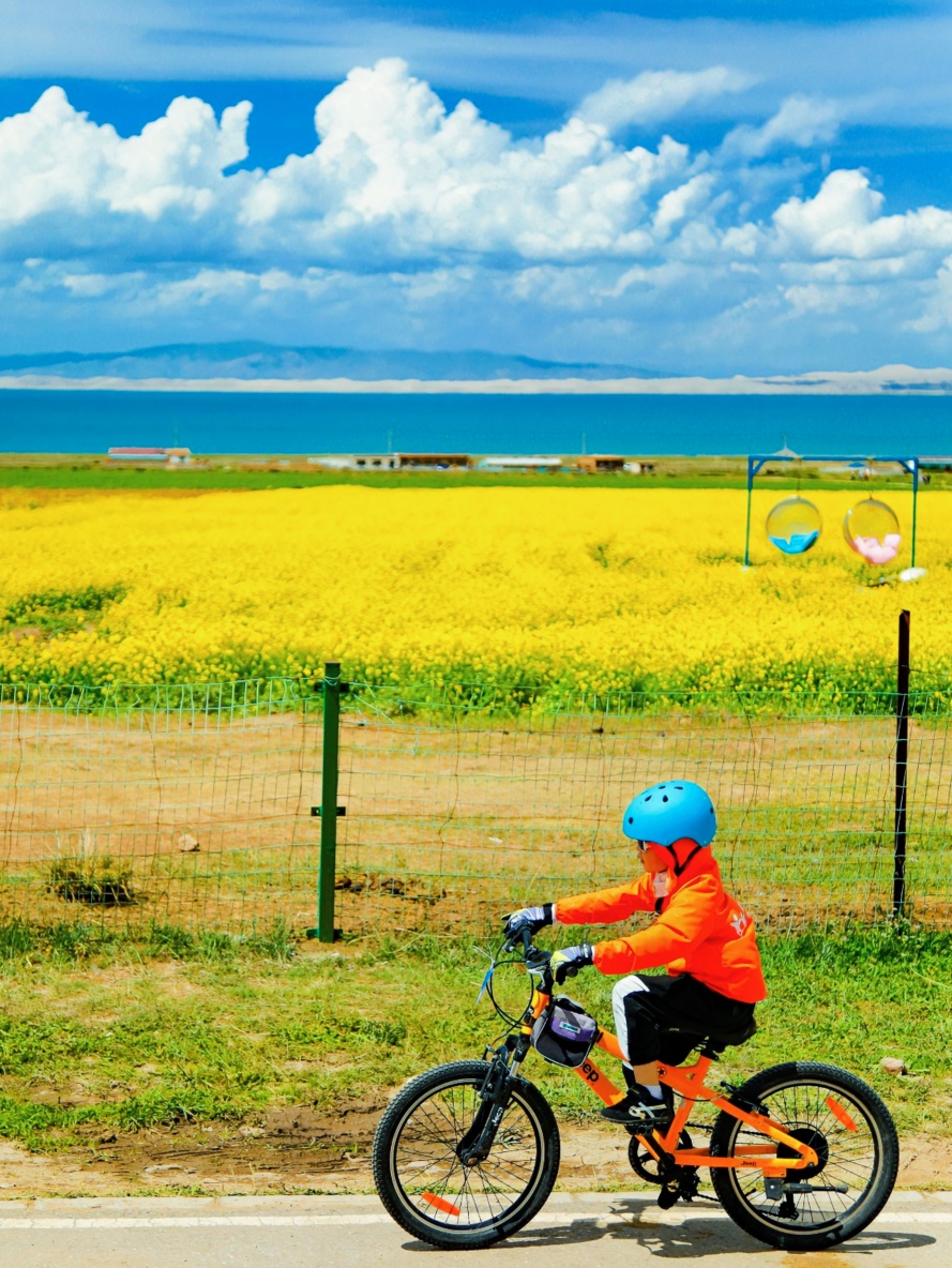 沿祁连山草原的彩虹公路骑行20公里,两侧尽是草原美景和错落有致的青稞田,油菜花田。路基下方既是高原蓝宝石青海湖,尝试用另一种视角感受青海湖的美。