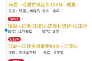 08:30准时出发,上午10点半左右到瑶里古镇,简单游览。中午午餐后我们前往右龙古道徒步,体力好的可以走10公里,体力差的可以走5公里精华段。