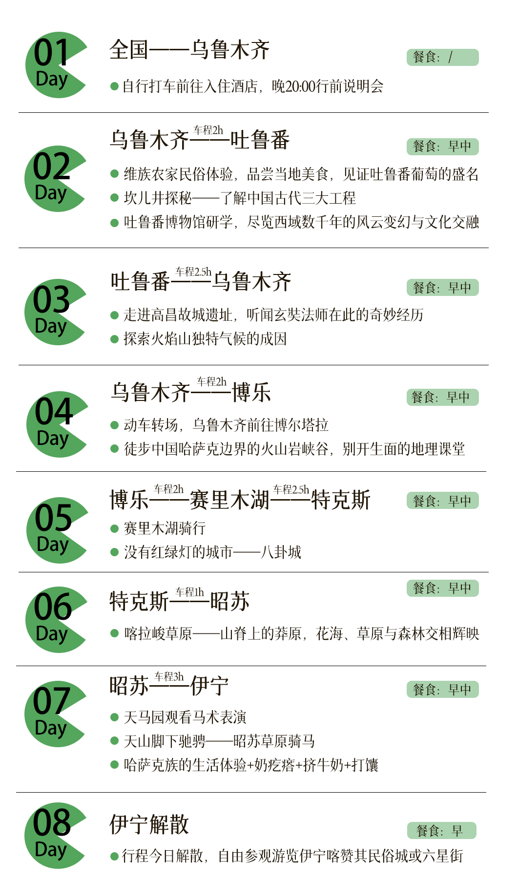 4.门票:含全程景点及首道门票(喀拉峻大草原景区、高昌古城景区、火焰山景区、怪石峪景区、赛里木湖景区、昭苏天马园景区、交河驿站坎儿井源景区、吐鲁番博物馆)