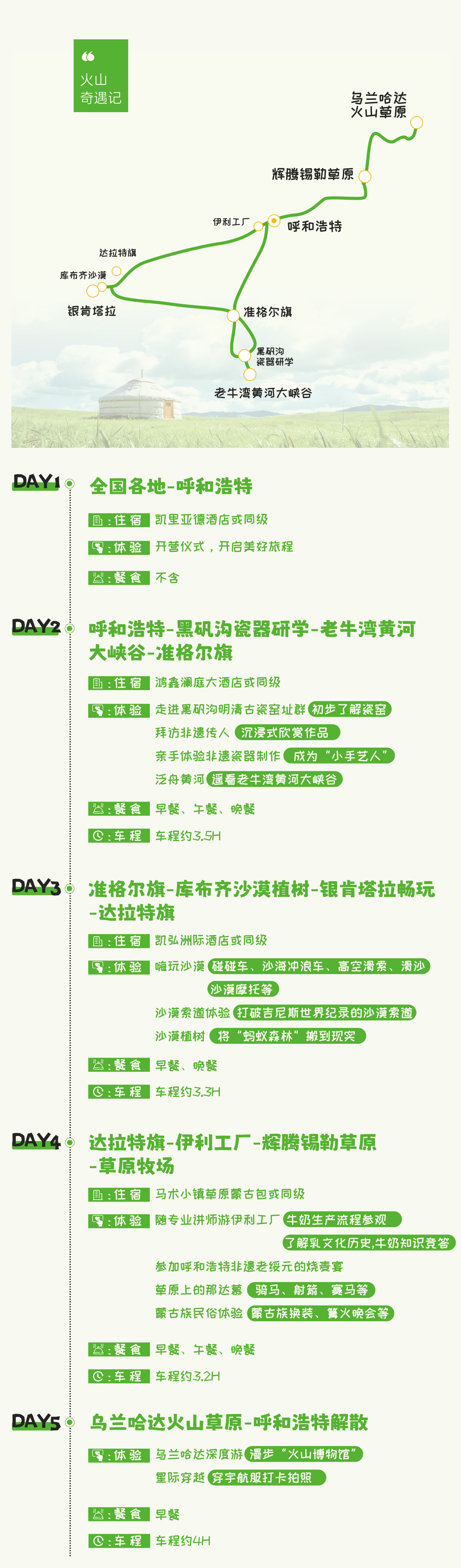 1、交通:呼和浩特出发及解散的全程专属用车及司机服务;