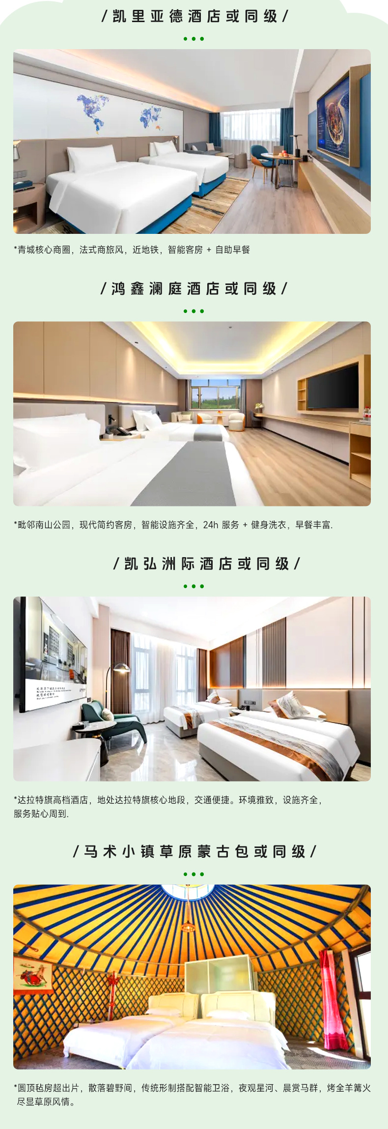 3、 行程中的所列的酒店类型,2星/2钻=经济型;3星/3钻=舒适型;4星/4钻=高档型;5星/5钻=豪华型;意为评定或条件到达相应标准的酒店,少部分地区,由于政策等因素,可能存在酒店条件满足,但未进行星钻评定的情况;