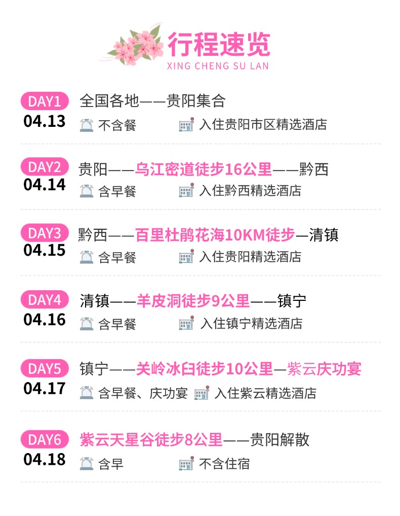 5、贵州部分酒店标准相比内地偏低,如遇旺季酒店客房紧张或政府临时征用等特殊情况,我社有权调整为同等级标准酒店,全程不提供自然单间,单房差或加床费用须自理;酒店限AM12:00时退房,晚航班返程者,建议行李寄存酒店前台,自由活动或自费钟点房休息。
